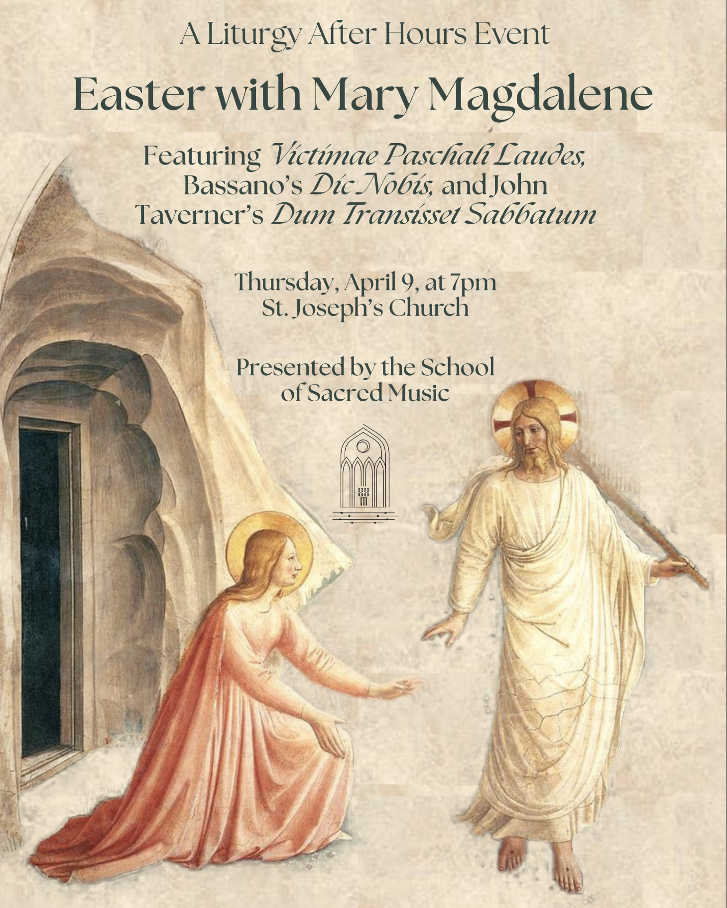 This lecture-concert features Victimae Paschali Laudes, Giovanni Bassano's Dic Nobis, and John Taverner's Dum Transisset Sabbatum.